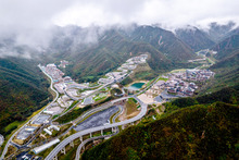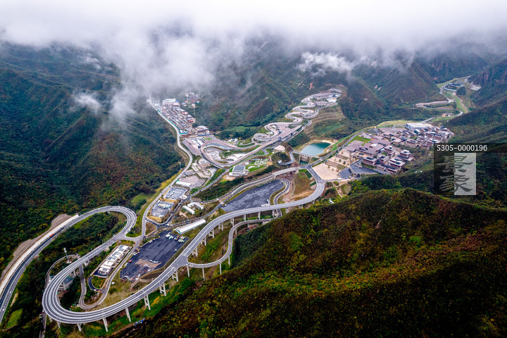 图片标题:     2022北京冬奥会和冬残奥会延庆赛区:国家雪车雪橇中心,无人机航拍,白云从镜头前飘过