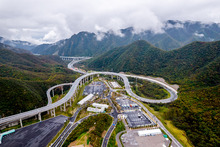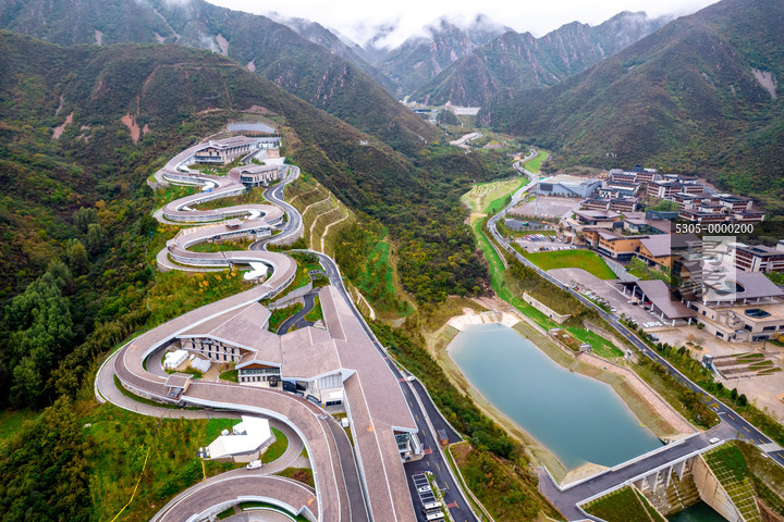 图片标题: 2022北京冬奥会和冬残奥会延庆赛区:国家雪车雪橇中心,无人机航拍,白云从镜头前飘过