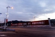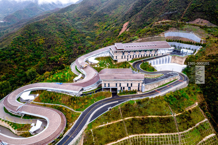图片标题: 2022北京冬奥会和冬残奥会延庆赛区:国家雪车雪橇中心,无人机航拍,白云从镜头前飘过