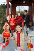 图片标题: 幸福的大家庭贴春联庆祝新年