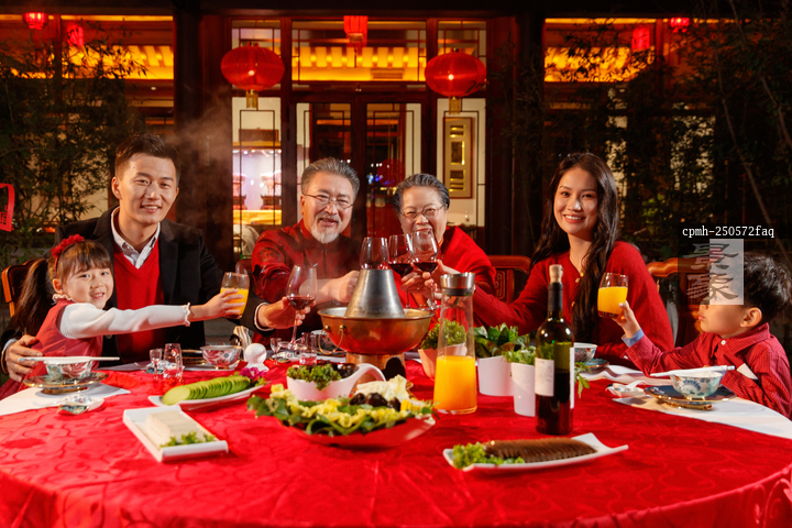 图片标题: 东方家庭在中式庭院内干杯庆祝新年
