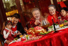 图片标题: 东方家庭在中式庭院内干杯庆祝新年