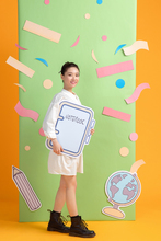 图片标题: 年轻女孩拿着灯泡和笔记本
