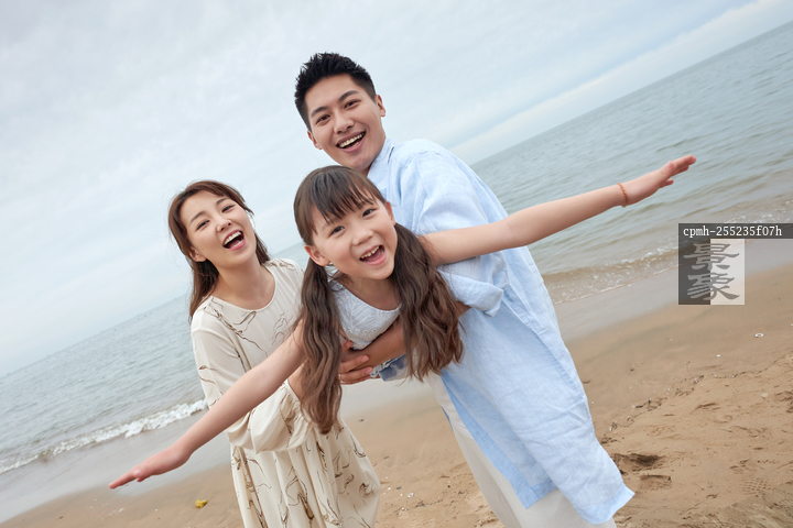 图片标题: 一家三口在海边玩耍