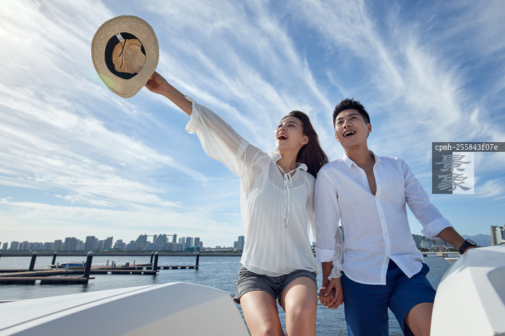 图片标题: 浪漫的青年夫妇乘坐游艇出海