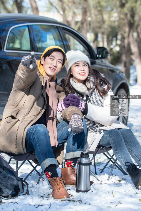 图片标题: 坐在汽车旁的青年夫妇