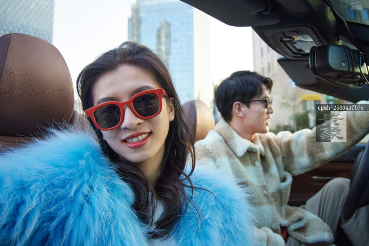 图片标题: 快乐的青年情侣驾驶跑车出行