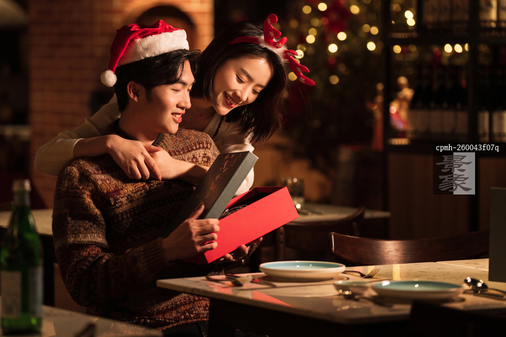 图片标题: 青年男人送女朋友圣诞礼物