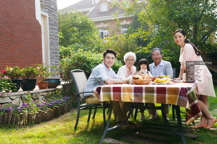 图片标题: 快乐家庭在户外吃早餐