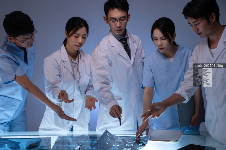 图片标题: 医务工作者用手指着X光片讨论研究