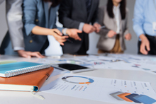 图片标题: 商务人士拿着铅笔指着报表分析研究