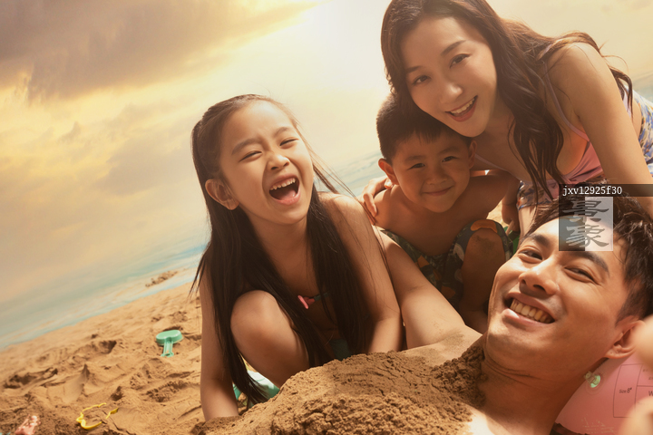 图片标题: 沙滩上男人和妻子孩子自拍