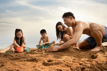 图片标题: 年轻父亲和女儿在沙滩玩耍