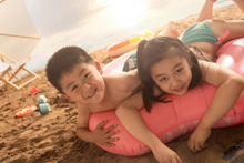 图片标题: 幸福的四口之家坐在沙滩上喝椰汁