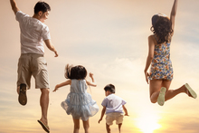 图片标题: 快乐的四口之家在沙滩上玩耍