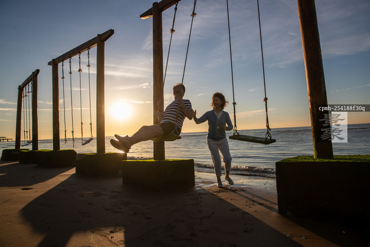 图片标题: 快乐的老年夫妇在海边荡秋千