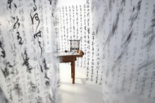 图片标题: 笔架上的毛笔和书法