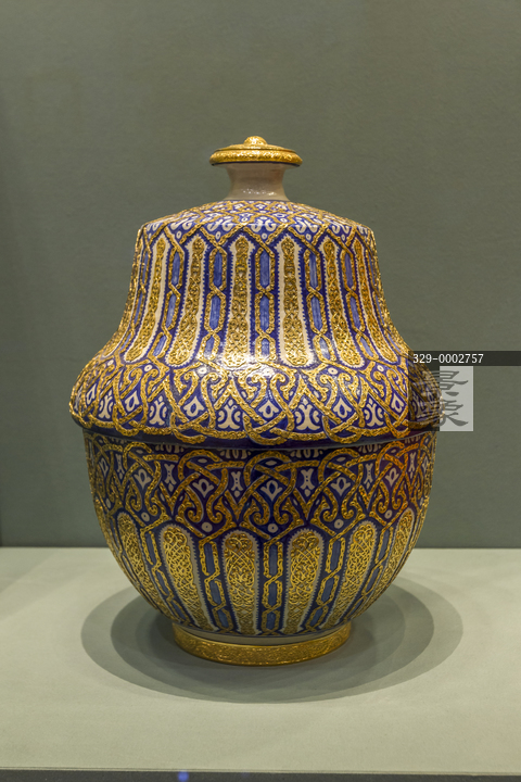 图片标题: 北京中央礼品文物管理中心-2006年摩洛哥国王赠胡锦涛的浮雕金青花瓷盖罐