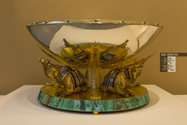 图片标题: 北京中央礼品文物管理中心-2001年镀金镶孔雀石卧驼银盘-阿联酋赠