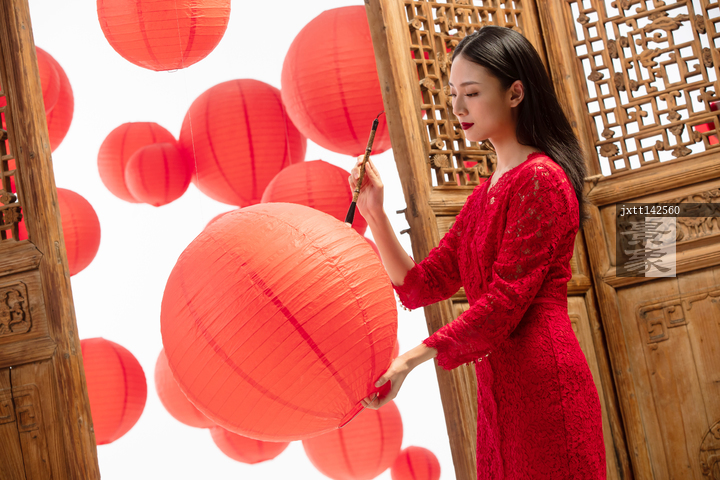 图片标题:     漂亮女人在红灯笼上书写