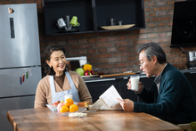 图片标题: 老年夫妇坐在院子里用手机视频