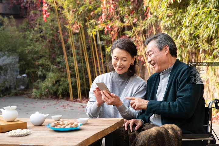 图片标题:     老年夫妇坐在院子里用手机视频