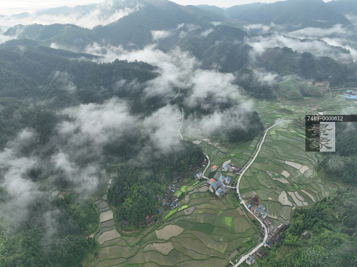 图片标题:     贵州锦屏:夏日晨雾山村美