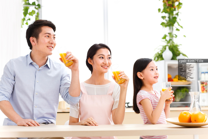 图片标题: 幸福的一家三口在喝果汁