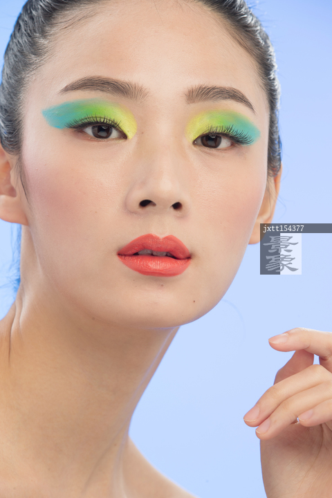 图片标题: 蓝绿色系夸张眼影美女妆面特写