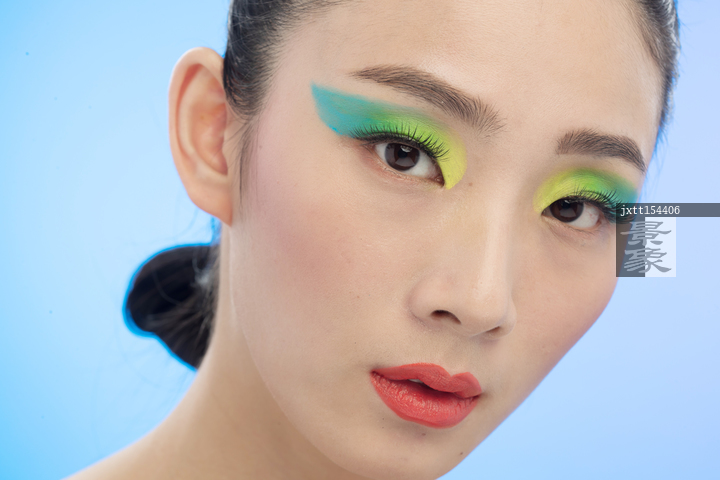 图片标题:     蓝绿色系夸张眼影美女妆面特写