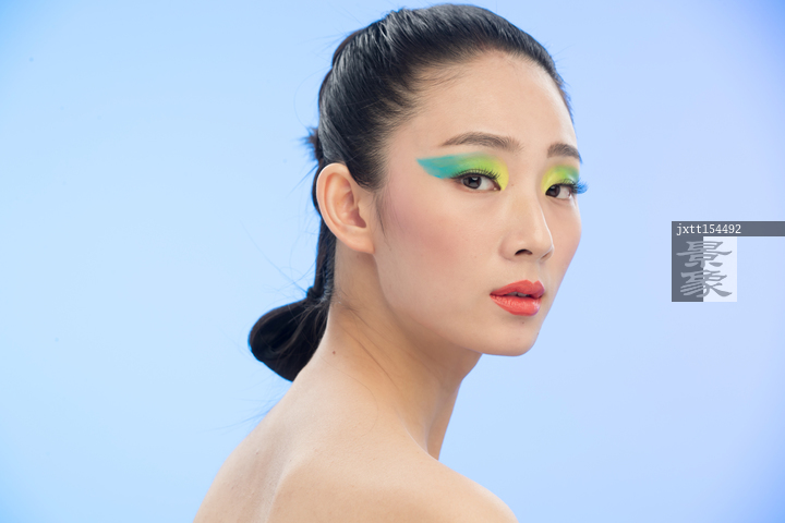 图片标题: 蓝绿色系夸张眼影美女妆面特写