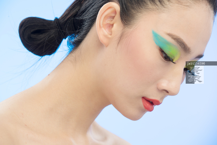 图片标题: 蓝绿色系夸张眼影美女妆面特写