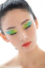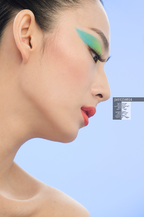 图片标题: 蓝绿色系夸张眼影美女妆面特写
