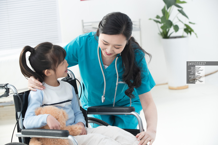 图片标题: 年轻女医生和坐轮椅的小女孩