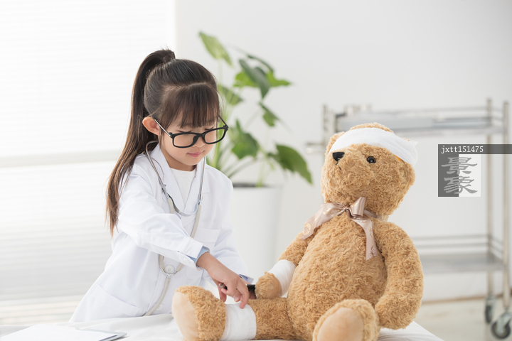 图片标题:     装扮成医生的小女孩给玩具小熊看病