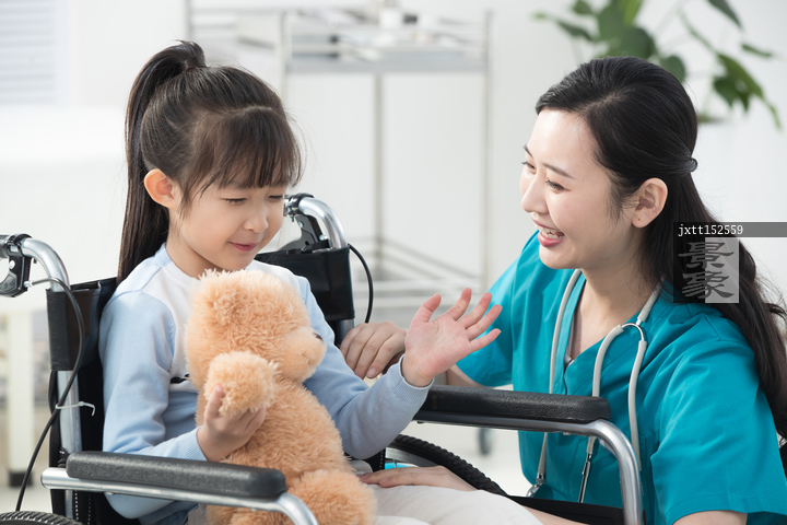 图片标题: 年轻女医生和坐轮椅的小女孩