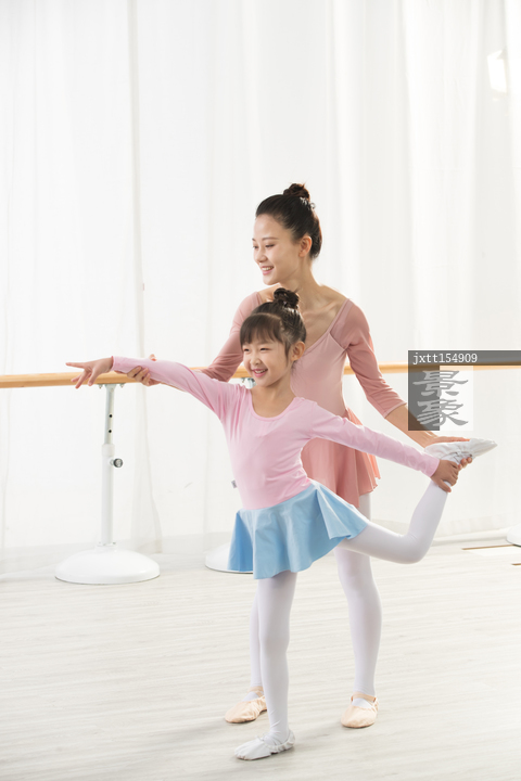 图片标题: 年轻舞蹈老师教小女孩跳舞