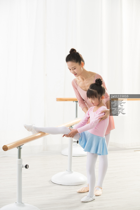 图片标题: 年轻舞蹈老师教小女孩跳舞