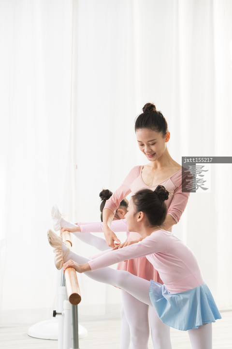 图片标题: 年轻舞蹈老师教小女孩们跳舞