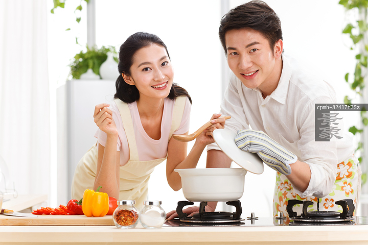 图片标题: 年轻夫妇在厨房煲汤