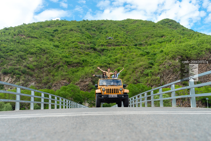 图片标题: 从汽车天窗探出身子兜风的年轻男女
