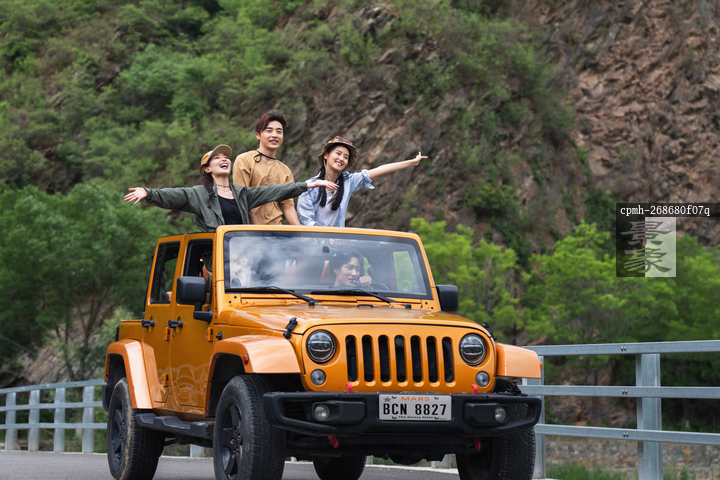 图片标题:     从汽车天窗探出身子兜风的年轻男女