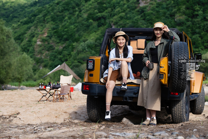 图片标题: 坐在汽车后备箱聊天的年轻闺蜜
