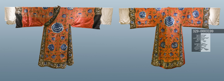图片标题: 中国工艺美术馆-粉墨传奇-清代红绸绣平金回纹地蓝花开氅