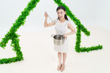 图片标题: 快乐家庭拿着绿色插头和灯泡