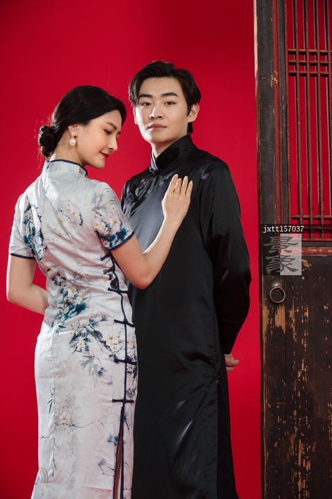 图片标题: 穿中式服装的年轻夫妇