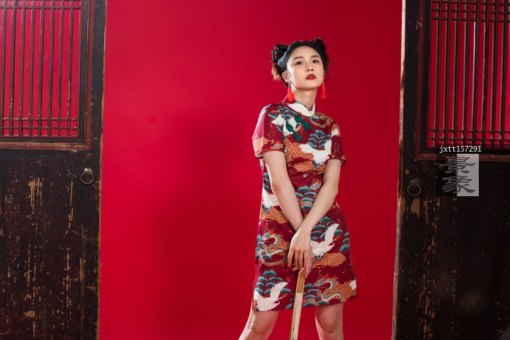 图片标题: 红色背景下的穿旗袍的青年女人