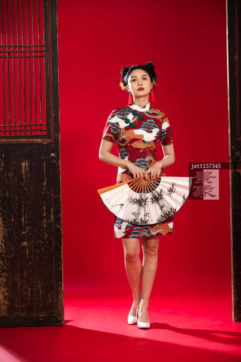 图片标题:     红色背景下的穿旗袍的青年女人