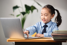 图片标题: 可爱的小学生用涂满颜料的手画画