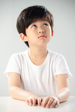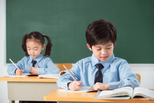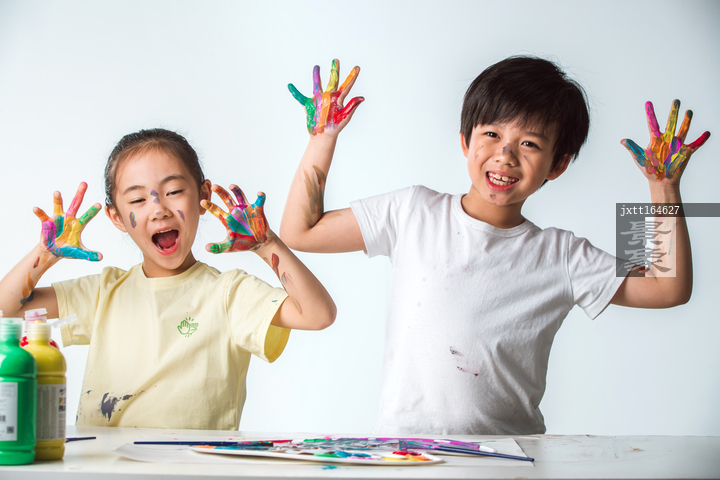 图片标题: 可爱的小学生用涂满颜料的手画画